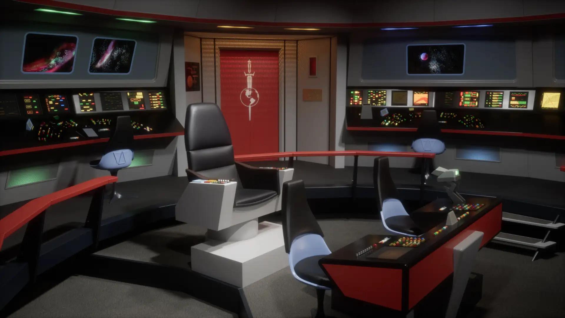 Located on the first deck of the primary hull, the main bridge of the I.S.S. Enterprise functioned as the ship’s command center. A swiveling command throne was located in a recessed area in the center of the room, granting its captain uninterrupted surveillance of all control consoles that operated specific areas of the ship. Piloting and navigation were carried out at the helm console, directly in front of the captain with a clear view of the main viewing screen. Along the perimeter of the bridge were consoles for communications, sciences, engineering, weapons, and environmental control. A symbol of the Terran Empire was emblazoned across the doors to the turbolift located behind and to port of the captain.