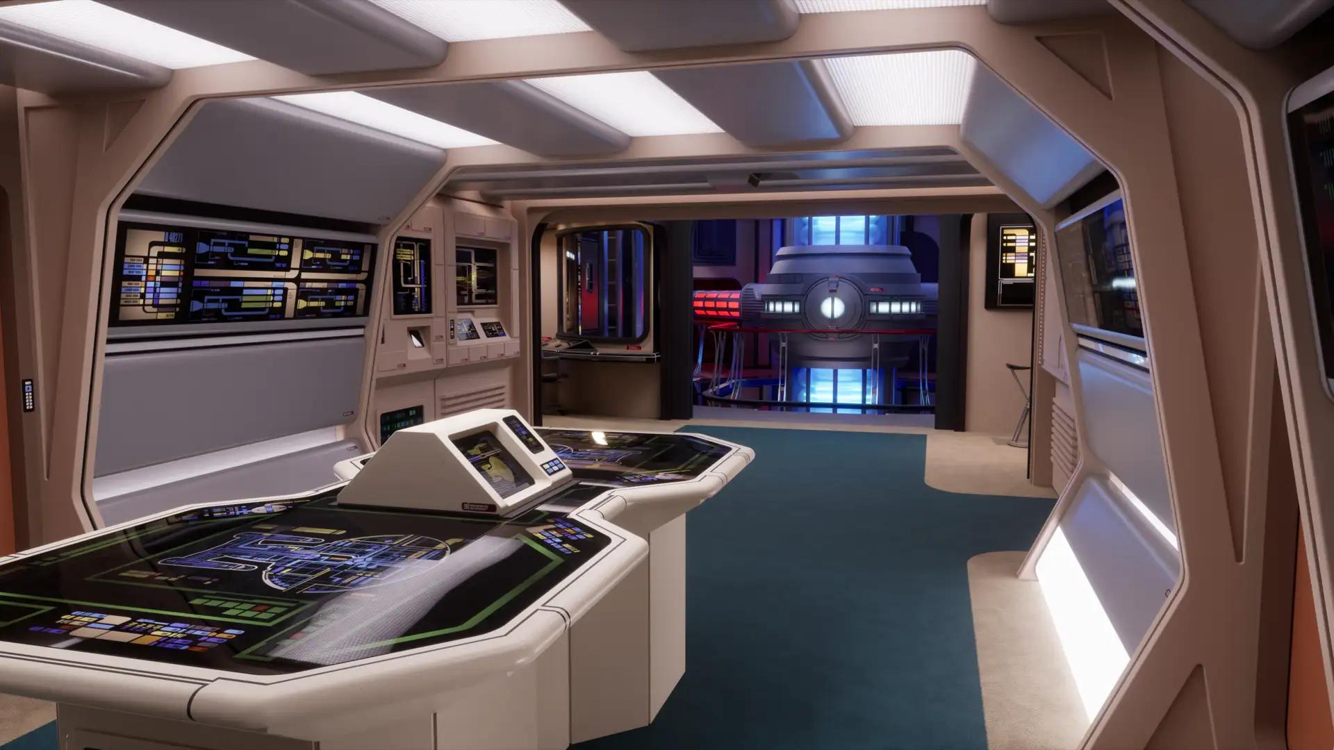 The fundamental structural components of the second floor were retained when adapting it for The Next Generation, but the rest of the set was completely reconstructed. The redesign resulted in an open floor plan with multiple corridors allowing access to the room. The distinctive "pool table" was first introduced in the episode "Where No One Has Gone Before," but the prop’s origins can be traced back to the Starfleet Command scenes in Star Trek IV: The Voyage Home. In the early scenes, the primary corridor passing through the set remained partially open. However, towards the episode's conclusion, the same door frame was enclosed by a console and permanently blocked off starting from the second season onward. The entire area saw frequent transformations to represent a spacious corridor junction, facilitating extended walking scenes as needed.