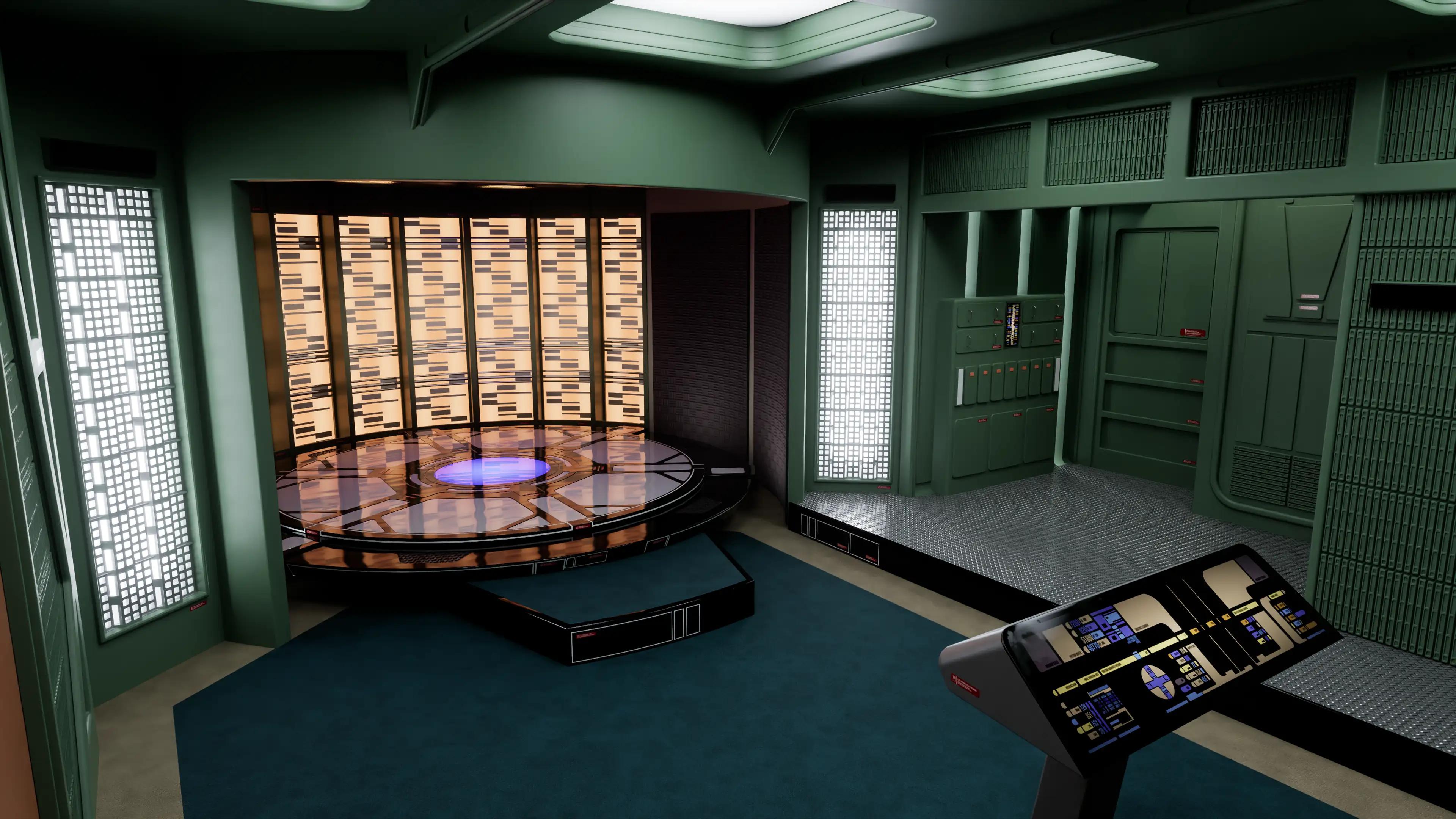 The transporter room played a vital role in the Enterprise-D’s operations, serving as the primary facility for beaming crew members and away teams to planetary surfaces and other spacecraft. The circular transporter chamber contained the imaging coils, the phase transition systems, and the confinement beam units used to dematerialize or rematerialize people and cargo being transported.