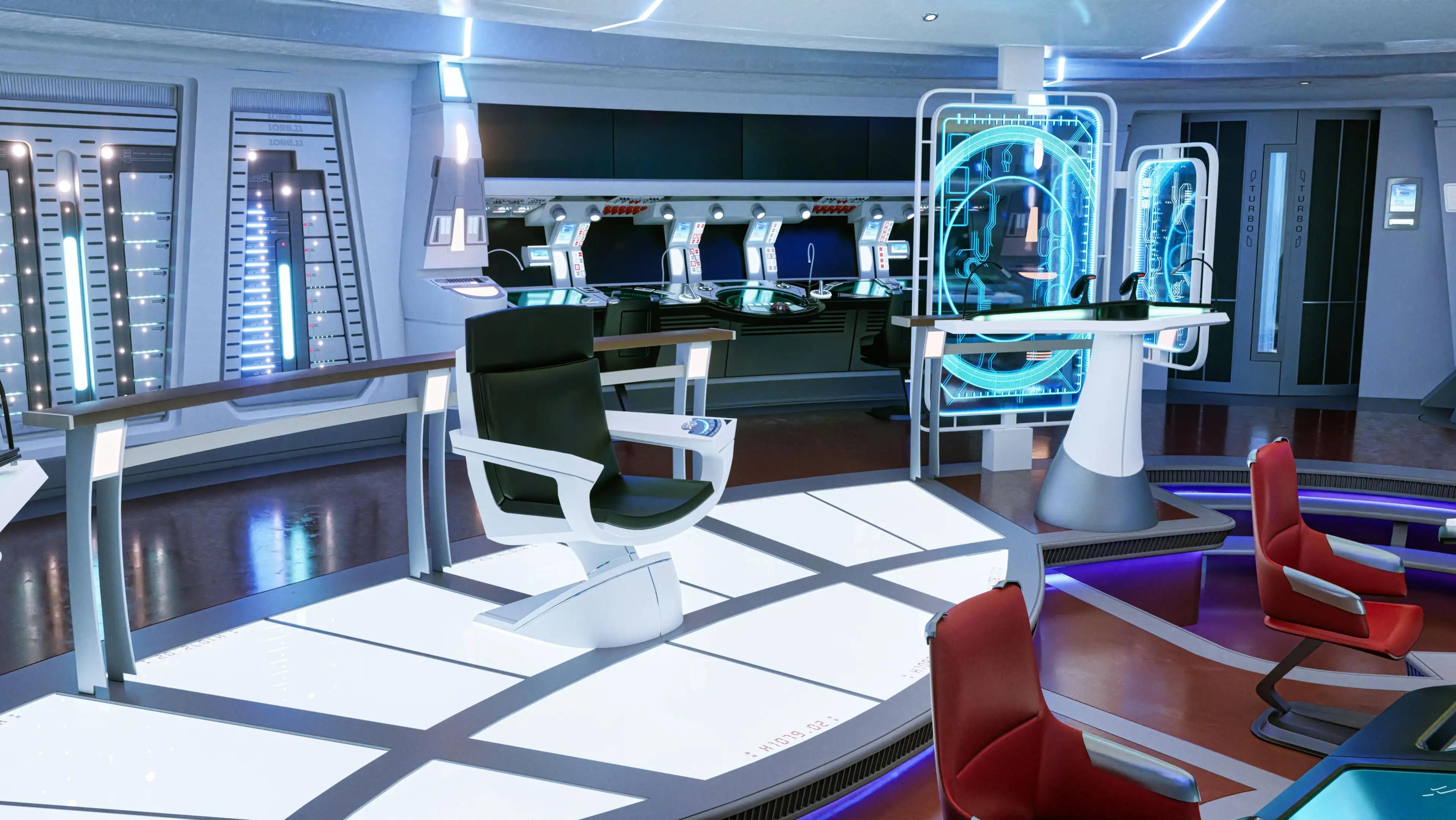 Evolving further from its appearance in Star Trek Into Darkness, the Beyond bridge omitted the ceiling dome that was present in prior configurations and featured adjusted lighting, including blue underlighting, as well as escape pod access in place of the consoles that were previously adjacent to the viewscreen. These escape pods were added for use in the shipwide evacuation during the Battle of Altamid.