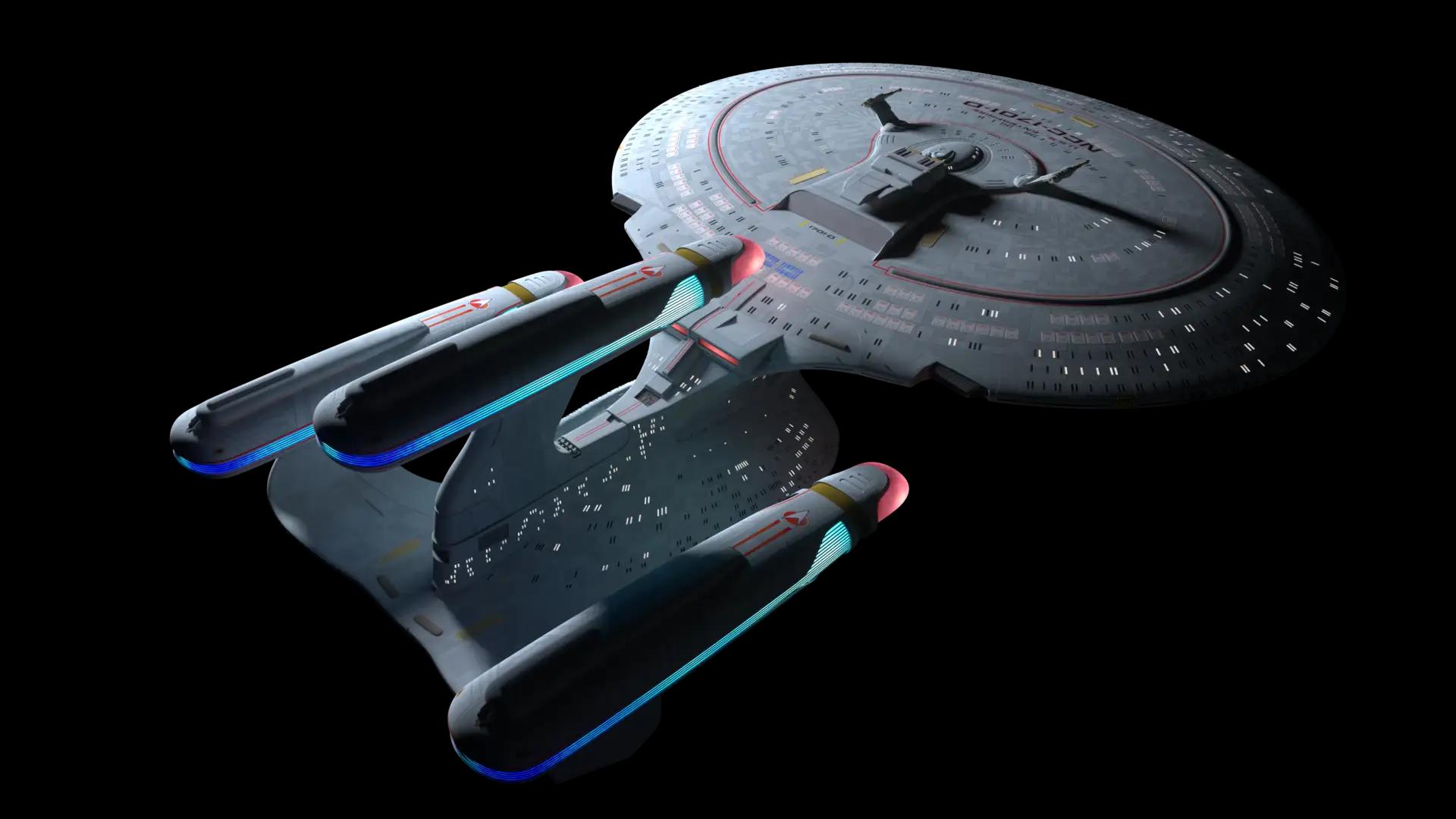 For its future variant appearance in "All Good Things..." the 4’ model of the U.S.S. Enterprise-D was endowed with various add-ons, designed in a collaborative effort by Dan Curry and Greg Jein.